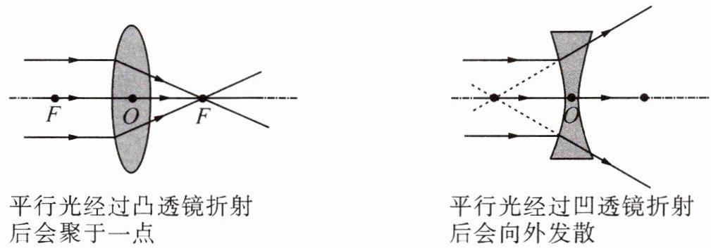(1)凸透镜;凹透镜 (2)会聚;跟主轴平行;焦点;光心;焦距;越小;越强 (3)发散;平行于主轴;反向延长线 (4)光心