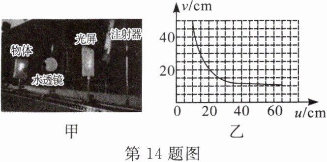 14. (6分)小科利用自制水透镜探究凸透镜成像的规律,如图甲所示,利用记录的实验数据,绘制了如图乙所示的像距v和物距u的关系图(实验时,水透镜厚度不变)。