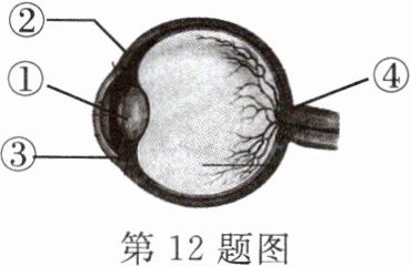 12. 眼对于我们认识世界至关重要,人通过眼获取了总量80%以上的信息。如图所示为眼的纵切示意图,据图回答下列问题。