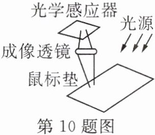 10. 光电鼠标在电脑中的应用非常广泛,其原理(如图所示)就是利用光源照射鼠标垫表面,并被传回光学感应器(相当于光屏)。当鼠标移动时,感应器会连续接收鼠标垫表面所成的像,并利用数字信号来处理、比较各个影像,以确定移动的距离和方向。产生的结果传回计算机,而计算机屏幕上的光标会根据这些结果来移动。图中光学感应器、凸透镜、光源等元件固定在鼠标内。