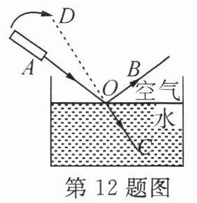 12. 小李用激光笔发出一束红光从空气斜射入水中的情景如图,图中______为入射光线,______为折射光线;保持入射点O不动,在竖直平面内,顺时针缓慢旋转入射光线AO至图中虚线DO位置,折射角将______(填“变大”“变小”或“不变”)。