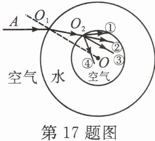 17. 在天宫课堂中,航天员王亚平将空气注入水球,形成的气泡球与水球的球心都在O点。一束光线从空气射入水球的光路如图所示,其中球心O与入射点$O_1$的连线为法线,则进入气泡球的折射光线可能为 ………( )