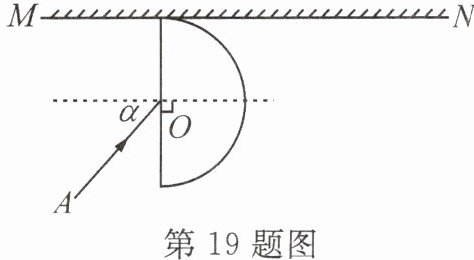 19. 如图所示,一束激光AO由空气射向半圆形玻璃砖的圆心O发生了反射和折射,发现在屏幕MN上出现了两个光斑。请画出形成两个光斑的光路图。