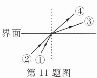 11. 如图所示是两束光在玻璃和空气中传播的光路,其中①和②是入射光线,③和④是折射光线。则入射光线②与折射光线______是同一束光,界面的上方是______(填“玻璃”或“空气”)。