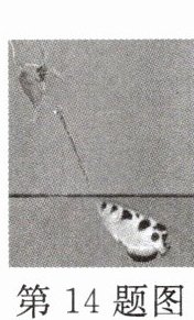 14. 射水鱼是一种小型观赏鱼类。如图所示,射水鱼看到水面上方的昆虫是光从______(填“空气射向水”或“水射向空气”)时发生折射形成的______(填“虚”或“实”)像。如果要射落昆虫,那么射水鱼应该向看到的昆虫的______(填“上方”或“下方”)射水。
