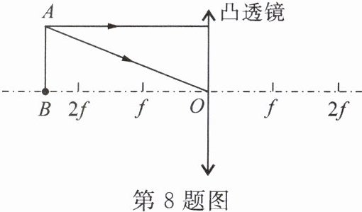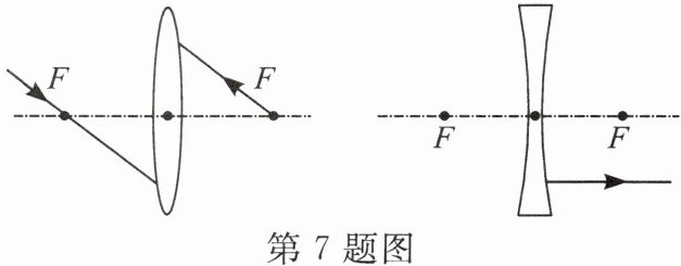 8. 请在图中画出两条入射光线经凸透镜后的折射光线(f为焦距)。