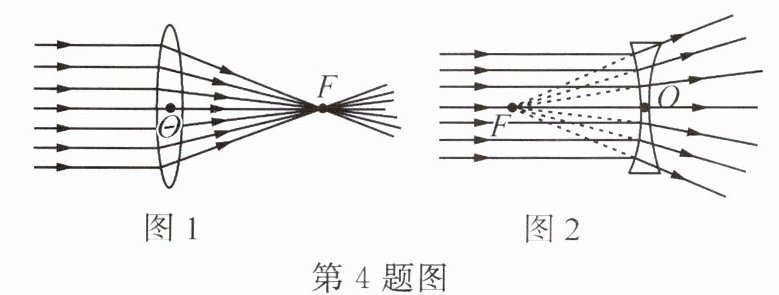 4. 如图1,与主光轴平行的光通过凸透镜后会聚在一点F,这个点叫作 ,它到透镜光心O的距离叫作 。如果把小灯泡放在这一点,则射向凸透镜的光经透镜后将变为 光。图2表明凹透镜对光有 作用。
