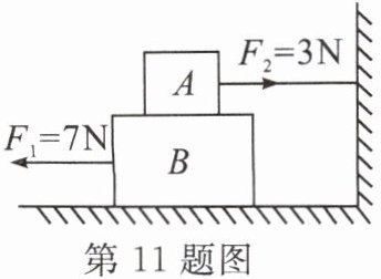11. 如图所示,在水平面上叠放着 A、B 两个木块,A 木块用一根细绳拴在墙面上。这时用力$ F_1= 7 $牛向左拉动 B,使它以 2 米/秒的速度做匀速直线运动,绳的拉力$ F_2= 3 $牛,则 B 木块与地面间的摩擦力大小为______牛。若增大拉力$ F_1,$则木块 B 受到地面的摩擦力______(填"增大""减小"或"不变")。