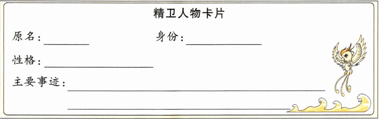 (4)女娃 炎帝的小女儿 示例:坚强、执着 游东海溺水而亡,化作名叫“精卫”的小鸟,经常叼着西山上的树枝和石块,用来填塞东海。