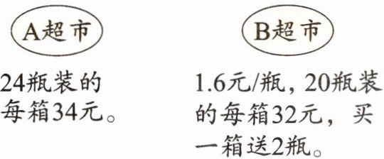 A超市:34÷24=1.41666…(元) B超市:32÷(20+2)=1.4545…(元) 1.41666…<1.4545… 答:A超市的矿泉水便宜。