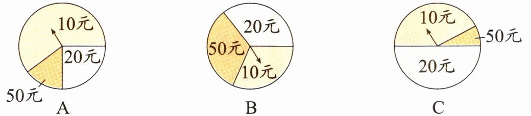 (1)转动( )转盘,获得50元购物券的可能性最小。