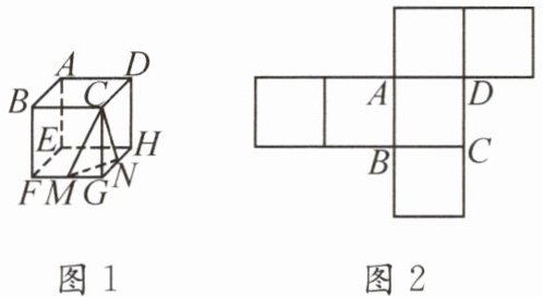 (2)(2025·编写)正方体(图1)的展开图如图2所示,在图1中M,N分别是FG,GH的中点,CM,CN,MN是三条线段,请在图2中画出CM,CN,MN这三条线段。