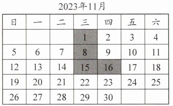 15. (2024·金牛)下表是$2023年11$月的日历,用如图所示的$L形框去框其中的4$个数。