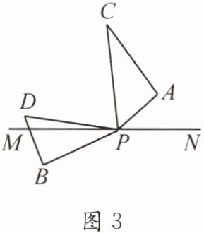 (3)如图3,若三角板PAC的边PA从PN处开始绕点P按逆时针方向旋转,转速为$5^{\circ}/s$,同时三角板PBD的边PB从PM处开始绕点P按逆时针方向旋转,转速为$3^{\circ}/s$,在两个三角形旋转过程中(PC转到与PM重合时,两个三角板都停止转动),问是否存在某个时刻,使∠BPN:∠CPD= 9:4,若存在,请求出t的值;若不存在,请说明理由.