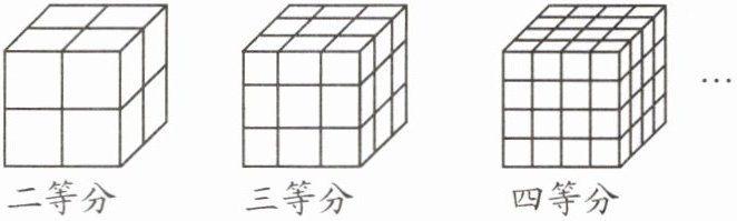 15. (2025·编写)将一个正方体的表面涂上颜色。如图,把正方体的棱二等分,然后沿等分线把正方体切开,能够得到8个小正方体,通过观察我们可以发现8个小正方体全是3个面涂有颜色的。
