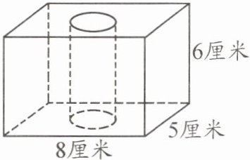 14. (2025·编写)如图,在一个长8厘米、宽5厘米、高6厘米的长方体中,从上面到底面挖一个底面半径是2厘米的圆柱体孔,剩下部分的体积是多少?剩下部分的表面积与原来相比是增加了还是减少了多少?(结果用π表示)