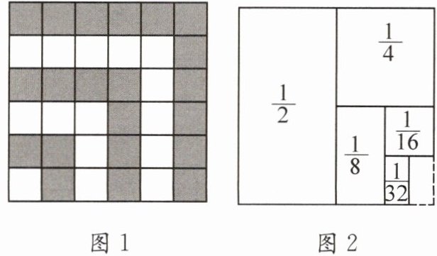 12. (2025·东部新区)“转化”是一种解决问题的常用策略,有时画图可以帮助我们找到转化的方法.例如借助图$1$,可以把算式$1 + 3 + 5 + 7 + 9 + 11转化为6^{2} = 36$.请你观察图$2$,可以把算式$\frac{1}{2} + \frac{1}{4} + \frac{1}{8} + \frac{1}{16} + \frac{1}{32} + \frac{1}{64} + \frac{1}{128}$转化为______.