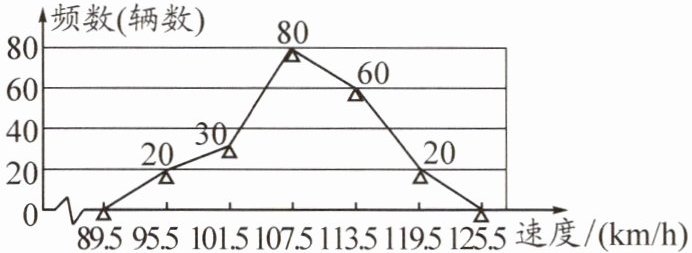 8. (2025·编写)超速行驶是交通事故频发的主要原因之一,交警部门统计某日 $ 7:00 \sim 9:00 $ 经过高速公路某测速点的汽车的速度,得到如下频数分布折线图,若该路段汽车限速 $ 110 km/h $,则超速行驶的汽车有( )