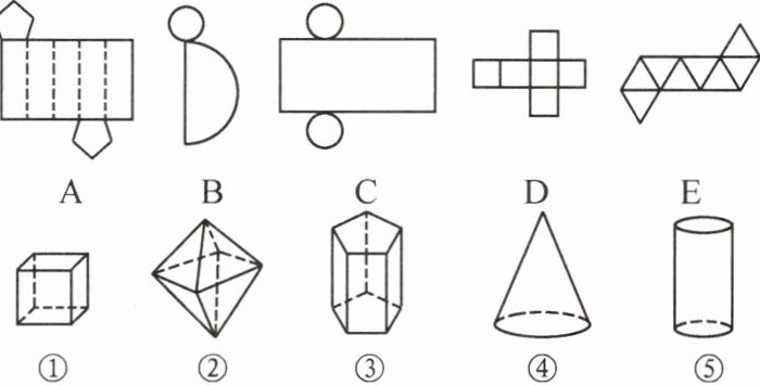 1. (2025·编写)下列第二行的哪种几何体的表面能展开成第一行的平面图形?请对应填空。