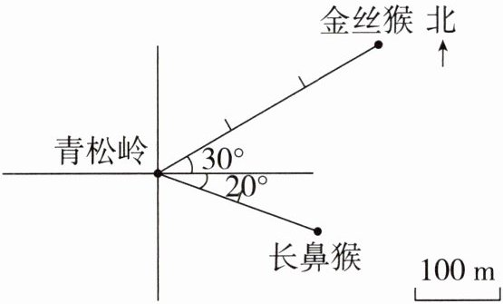 1. 金丝猴住在青松岭北偏东 $30^{\circ}$ 方向 300 m 处。长鼻猴住在金丝猴南偏东 $20^{\circ}$ 方向 200 m 处。壮壮画的图示对吗?如果不对,请你在原图上改正。
