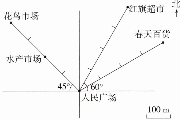 (1)红旗超市在人民广场( )偏( )( )方向上,距离是( )。