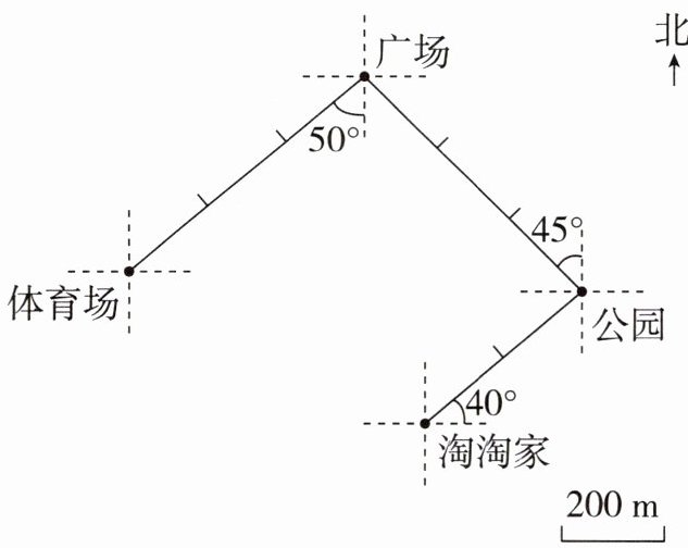 (1)爷爷从淘淘家出发,沿( )偏( )( )方向跑( )到公园,接着沿( )偏( )( )方向跑( )到广场,再沿( )偏( )( )方向跑( )到体育场。