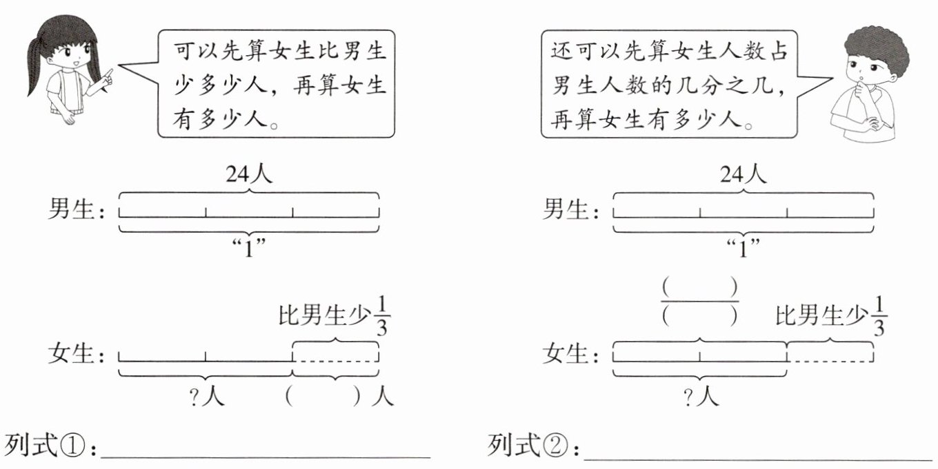 列式①:$24-24× \frac{1}{3}=16$(人) 列式②:$24× (1-\frac{1}{3})=16$(人)