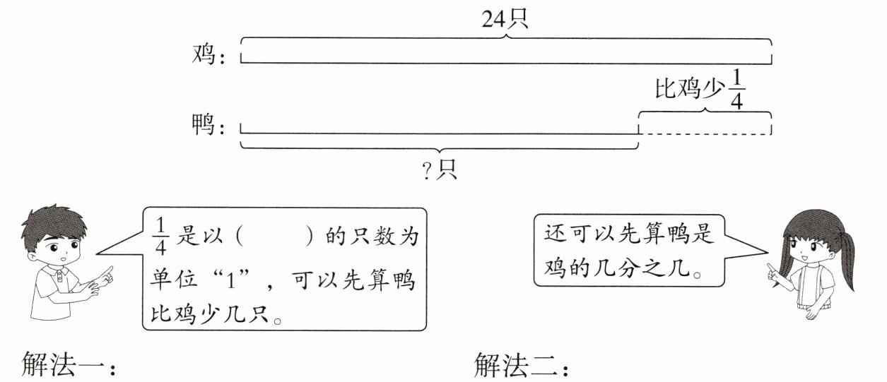鸡 解法一:24-24×$\frac{1}{4}$=18(只) 解法二:24×(1-$\frac{1}{4}$)=18(只)