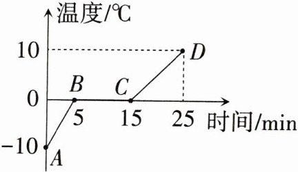 解析 晶体熔化时,吸收热量,温度不变,内能增加。由图可知,物质在AB、CD段分别加热5min、10min,温度都升高10℃,根据$Q=cm\Delta t$可知,比热容之比$\frac{c_{AB}}{c_{CD}}=\frac{Q_{AB}}{Q_{CD}}=\frac{5}{10}=1:2$。