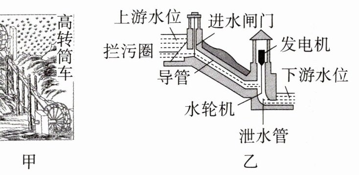 7. 【物理与生活】人类文明,一脉相传。从远古的高转筒车,到今天的水电站,都是人类对水能的开发与利用。图甲是高转筒车,下方转轮安装在河道中,流水驱动轮子转动,系在传动绳索上的竹筒将水从河里源源不断输送到上方农田中;图乙是水电站,流水冲击水轮,带动发电机发电。下列说法正确的是( )