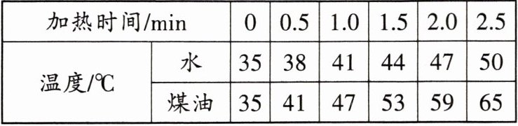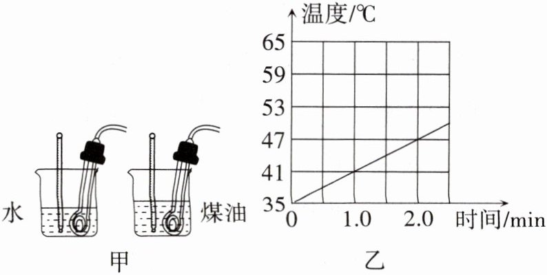 12.为了比较水和煤油的吸热能力,某同学做了如图甲所示的实验。在两个相同的烧杯中,分别装有水和煤油,用相同的电加热器分别对它们进行加热,当温度达到35°C时开始计时。下表是每隔0.5min记录的数据,并由此绘制了水的温度随加热时间变化的关系图像,如图乙所示。请你解答下列问题: