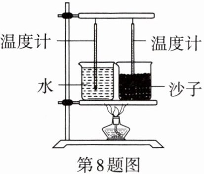 8.在比较不同物质的吸热能力实验中,同学们用酒精灯同时开始均匀加热质量和初温都相等的沙子和水(水未沸腾),如图所示。关于该实验,下列说法正确的是 ( )