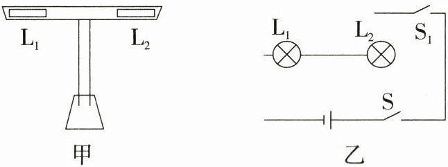 20.如图甲、乙为一款节能钢琴灯的实物结构和简化电路图。灯$L_{1}和L_{2}$并联,当只闭合开关S时,只有灯$L_{2}$亮;当开关S、$S_{1}$都闭合时,两灯都亮;当只闭合开关$S_{1}$时,两灯均不发光。请你用笔画线代替导线将图乙的电路补充完整。