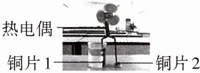 1.用两块铜片、热电偶、电动机(带风扇)组成一个电路,铜片1插在$90^{\circ }C$热水中,铜片2放在空气中,如图所示,半分钟左右风扇发生转动,这就是温差发电现象。下列有关说法正确的是 ( )