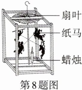 8.【中华传统文化】如图为我国特色工艺品走马灯。使用时,点燃底部的蜡烛,热空气上升驱动扇叶转动,从而能看到纸马的影子动了起来。热空气上升驱动扇叶转动的过程中, _ 能转化为 _ 能,这与四冲程汽油机 _ 冲程的能量转化情况相同。某单缸四冲程汽油机在1s内完成了15个工作循环,则该汽油机工作时曲轴的转速为 _ r/min。