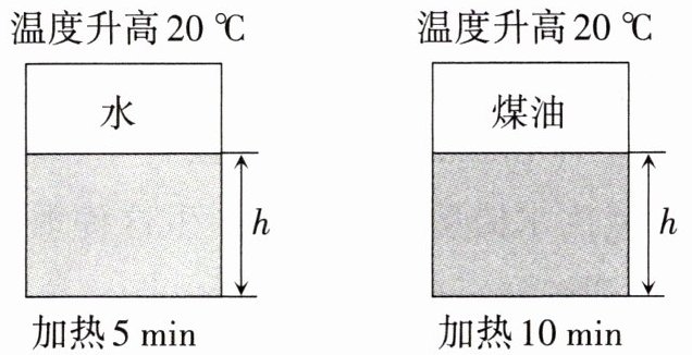 解析根据比较不同物质吸热能力的方法,实验中要控制不同物质的质量相同;图中水和煤油的体积相同,而水的密度大于煤油的密度,根据$m = \rho V$可知,水的质量大于煤油的质量,故图中的一处错误为:水和煤油的质量不相等。水的比热容比煤油的大,质量相同的水和煤油升高相同的温度,水吸收的热量多,即水的加热时间长,故图中的另一处错误为:水的加热时间小于煤油的加热时间。