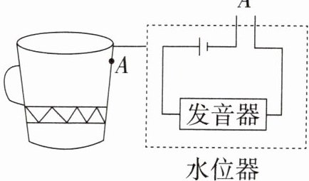 7. 小明设计并制作了一个“盲人水杯”,其工作原理如图所示。杯中近杯口处A点是水位器的两个触点,当杯中的水位到达A位置时,水位器会自动播放音乐,提醒盲人水已盛满。杯口处两个触点的作用相当于 ( )