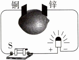 3. 小健同学将铜片、锌片插入柠檬,制成柠檬电池。如图所示,闭合开关S,发光二极管发光,此过程的能量转化情况是______转化为电能,电能再转化为光能。由图可知,铜片是柠檬电池的______极。现将发光二极管的正、负接线柱对调,二极管不发光,这说明发光二极管具有______的特性。