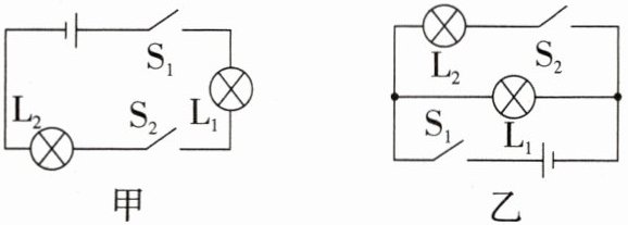 A. 图甲的串联电路中,一个开关只控制一个用电器