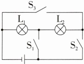 解析闭合开关S₁时,只有灯L₁接入电路,灯L₁亮;闭合开关S₁、S₂时,灯L₂被短路,灯L₁亮;闭合开关S₂时,灯L₁和L₂串联;闭合开关S₁、S₃时,灯L₁和L₂并联;同时闭合开关S₂、S₃会造成电源短路,是不允许的。