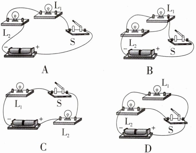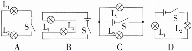 1.C 解析选项A、B、D中,电流只有一条路径,两灯串联。故选C。