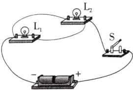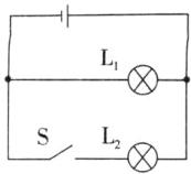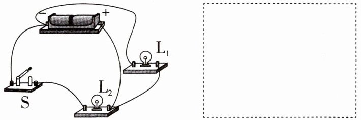 1. 如图是一个未完成连接的实物电路。请用笔画线代替导线将电路连接完整。要求:灯$L_1、$$L_2$并联,开关S同时控制两盏灯,导线不能交叉。