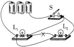3. 如图所示的实物电路中,灯$L_1、$$L_2$应该并联,但有一根导线连接错误,请在错误的导线上打“×”,并在图上用笔画线代替导线将电路连接正确。