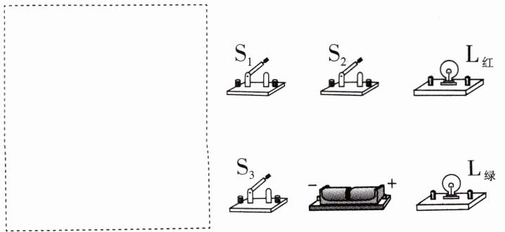 15. 某保密室有三道门,关上一道门相当于闭合一个开关。只要有一道门没有关上,红色和绿色的指示灯都会发光。当三道门都关上时,红灯会熄灭,只有绿灯会发光。请设计出符合要求的电路图,画在虚线框内,并根据所设计的电路图用笔画线代替导线将实物连接成符合要求的电路。(要求:导线不能交叉)______