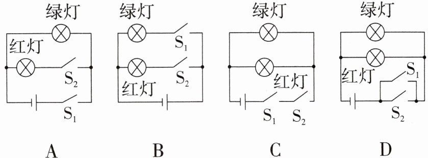 B 解析 由题意可知,当水流温度低于40℃时,感应开关S₁闭合,只有绿灯照亮水流,说明感应开关S₁只控制绿灯,因此感应开关S₁与绿灯串联;当水温达到40℃及以上时,感应开关S₂闭合,只有红灯照亮水流,说明感应开关S₂只控制红灯,因此感应开关S₂与红灯串联;因为绿灯和红灯工作时互不影响,所以绿灯与红灯并联。故选B。