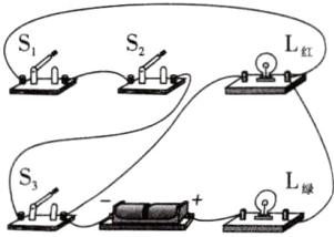 指示灯与电源组成通路时指示灯亮,电路是断路或指示灯被短路时指示灯熄灭,当三道门都关上即三个开关都闭合时,红灯会熄灭,绿灯会发光,此时红灯被短路、绿灯连入电路,三个开关相互影响,故三个开关应该是串联后再与红灯并联。