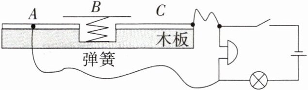 亮 响 解析弹簧上的金属片B相当于开关,当有人把物品搬离展台时,金属片B在弹力作用下与金属片A、C分开,灯泡和电铃串联接入电路,此时灯亮铃响。