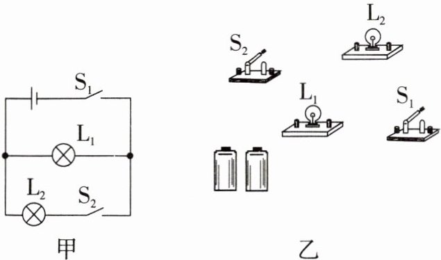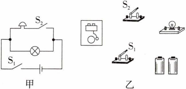 7. 小林同学在学习了串、并联电路的连接后,在实验室借到了如下器材:小电铃一个、小灯泡一个、开关两个、干电池两节。请你帮助他按照图甲所示的电路图,将图乙中各元件连接起来。(要求导线不能交叉)