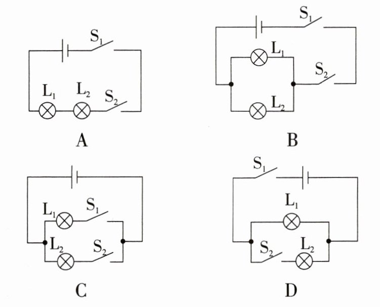 D 解析 由实物图知,L₁、L₂两灯并联,开关S₁在干路上,开关S₂在灯L₂所在的支路上,D正确。