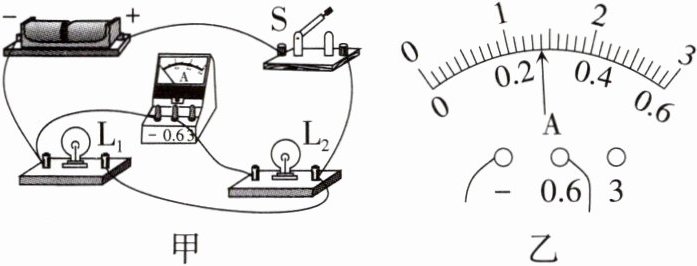 5. 如图甲所示的电路,当闭合开关S后,电流表测量的是通过______(选填“$L_{1}$”“$L_{2}$”或“$L_{1}和L_{2}$”)的电流,电流表的指针偏转如图乙所示,使用该量程时电流表的分度值是______A,此时电流表的示数为______A。